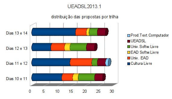 Já tivemos três dias de discussões sobre diversos temas relacionados com universidade, EAD e softwre livre, principalmente focando a questão da liberdade na internet. O graico abaixo mostra a distribuição de temas no UEADSL2013.1. Segundo depoimentos de ...