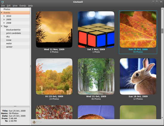 Shotwell é um programa open source projetado para ajudar na organização de imagens e colaborar com algumas ferramentas de edição básica de imagens. Ele é um aplicativo que importa fotos de qualquer pasta do computador. Com ele, o usuário pode capturar todas as imagens do seu computador e depois organizá-las por eventos.
