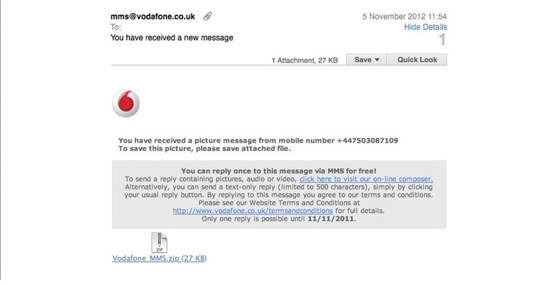 Cibercriminosos estão empenhados em uma campanha de propagação de malware, enviando um grande número de mensagens de e-mail que, supostamente, seriam MMS gateway da Vodafone. Esses e-mails aparecem com o seguinte tema: "Você recebeu uma nova mensagem" e afirmam que foi enviada uma mensagem via MMS a partir de um cliente Vodafone. O endereço de e-mail da Vodafone utilizado e o suposto número de telefone que envia as mensagens varia; isso acontece porque o código do país é alterado com base no local alvo. Por exemplo, no Reino Unido os e-mails são enviados de [email protected] e terão o código do país, que é 44, enquanto na Alemanha as mensagens supostamente seriam enviadas do endereço [email protected], e carregam um 49 na frente do número de telemóvel.
