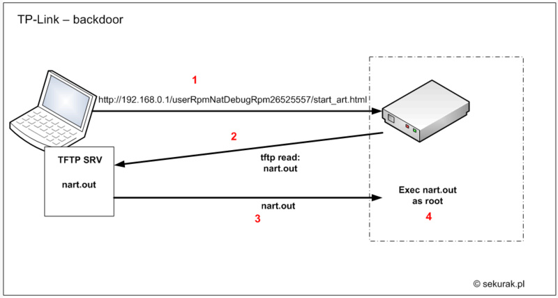 Especialistas em segurança na Polônia, descobriram existência de um backdoor em vários modelos de roteadores fabricados pela TP-Link. Quando uma URL especialmente criada for solicitada, o roteador irá responder via download e a execução de um arquivo de computador é colocada em prática, relata Michał Sajdak de Securitum. O especialista diz que, a partir do momento em que um navegador envia uma solicitação HTTP GET para http://192.168.0.1/userRpmNatDebugRp...start_art.html , o roteador contactado irá estabelecer uma conexão com IP do visitante, e fará contato com qualquer servidor TFTP.