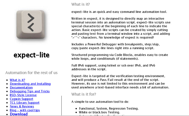 O expect-lite efetua um wrap na poderosa ferramenta Expect, de uma maneira que permite aos usuários sem conhecimento da sintaxe nativa do Expect, utilizá-lo. Em vez disso, o expect-lite utiliza um número de caracteres especiais que podem ser inseridos via comando de terminal para construir os scripts. A ferramenta apresenta programação estruturada com a ajuda de blocos de código e inclui um depurador poderoso, além do suporte para IPv6. Com o expect-lite os usuários podem escrever scripts automatizados para realizar testes de regressão e tarefas do sistema, ou mesmo, efetuar validações de compilação.