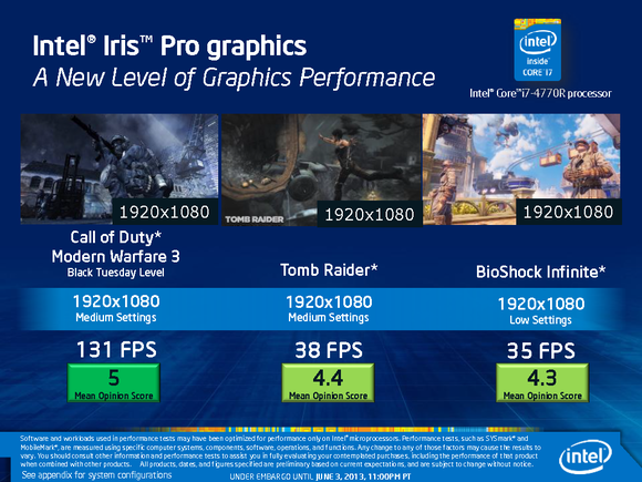 Talvez reconhecendo que os compradores de computadores PC (com exceção dos aficionados por produtos tudo-em-um) preferem utilizar um cartão de vídeo standalone com um processador gráfico poderoso como os comercializados pela AMD e Nvidia, a Intel revelou apenas uma CU para desktop embarcada com seu alardeado processador gráfico Intel Iris Graphics 5200: o Core i7-4770R. E essa parte estará disponível apenas em um pacote BGA (o acrônimo para "Ball Grid Array", um processo de montagem de processadores de forma permanente na placa de circuito primária direto da fábrica, impedindo sua remoção para upgrades). Esse tipo de estratégia você espera vir em produtos do tipo all-in-one, e talvez em novas formas como tablets do tipo tabletop. Mas NUNCA em um desktop PC.