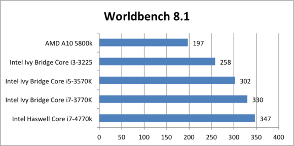 O Core i7-4770K da Intel ficou em primeiro lugar em praticamente todos os benchmarks realizados, marcando 347 no Desktop Worldbench 8.1. O Worldbench 8.1 é uma amálgama sintética e benchmark para testes projetado para oferecer uma visão holística do desempenho de computadores. Ele mede aplicações de uso intensivo de gráficos como os jogos, assim como as aplicações que fazem uso intensivo de CPU como os editores de vídeo e fotografia. O A10-5800K da AMD ficou em último lugar com uma pontuação de 197.