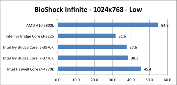 E quando foi medido apenas a performance em jogos, rodando o BioShock Infinite com uma resolução de 1024 por 768 pixels, com qualidade visual marcada como baixa, o processador da AMD ficou em primeiro lugar, oferecendo uma marca de 54,8 frames por segundo. Já o Core i7-4770K da Intel fez uma marca melhor que todos os seus primos mais velhos durante o teste, mas sua taxa de frames ficou em 45,4 frames por segundo, o que significa 17 por cento mais lento que o processador da AMD.