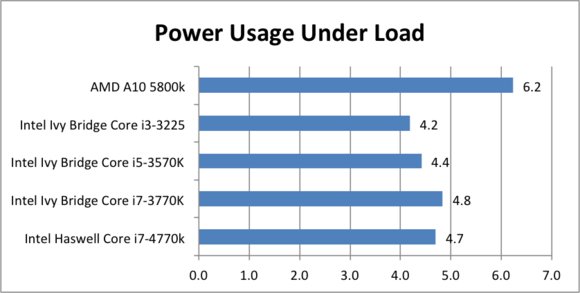 Mas quando o assunto é carga pesada, o Core i7-4770K consumiu bem menos energia que a CPU AMD 10-5800K. Ela chegou a ser até 24 por cento mais eficiente que o processador da AMD quando sob carga.