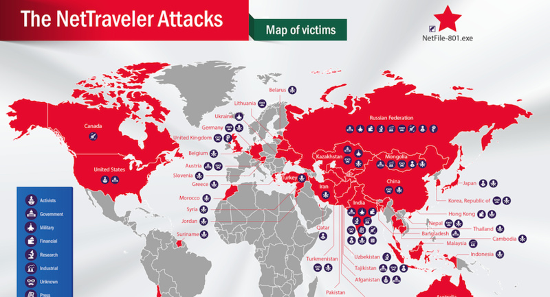 Especialistas da Kaspersky Lab publicaram um novo relatório de pesquisa sobre o NetTraveler, que é uma família de programas maliciosos usados por atacantes cibernéticos, aptos a comprometer com sucesso mais de 350 vítimas de alto perfil, em 40 países. O grupo NetTraveler infectou vítimas em vários estabelecimentos, tanto no setor público quanto no setorprivado, incluindo instituições governamentais, embaixadas, indústria de petróleo e gás, centros de pesquisa, prestadores de serviços militares e ativistas.