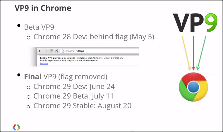O VP9 é projetado para ter 50 por cento a menos de bit rates que seu predecessor, a codec VP8, e é esperado encarar o High Efficiency Video Coding (HEVC/H.265), o sucessor do H.264, que entrou em campo pela ITU e ISO/MPEG em Janeiro último.