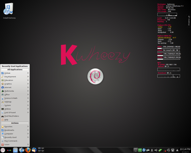 Kwheezy é uma distribuição Linux baseada no Debian, que traz um ambiente desktop KDE bastante intuitivo e uma boa seleção de software open source GNU / Linux. Ele também inclui drivers de dispositivos populares, codecs de mídia e plugins do navegador, todos pré-configurados e pronto para uso.