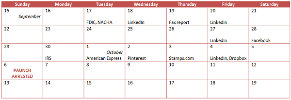 Entretanto, é preciso ser bem claro: nas duas semanas desde a prisão de "Paunch", as significativas investidas de spam cessaram. Também não foram observadas quaisquer outras grandes campanhas que usam kits de exploração semelhantes. O calendário abaixo mostra as principais campanhas de spam que tem sido monitoradas nas semanas que antecederam a prisão do "Paunch":