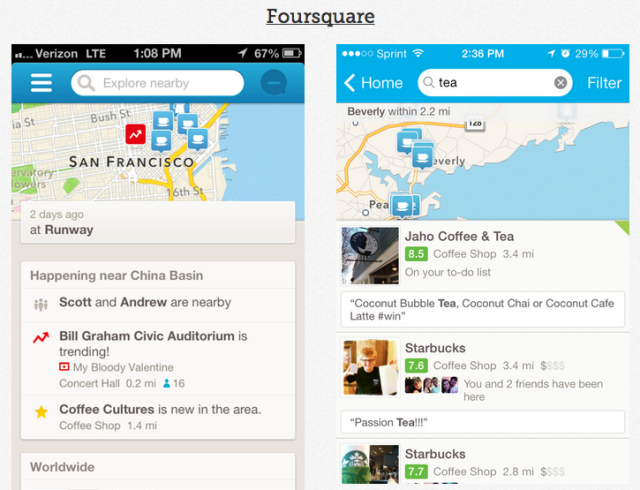 Apenas dois meses após o lançamento do sistema operacional iOS 7 da Apple, a equipe do Foursquare já está presente com uma aplicação para iPhone completamente renovada, trazendo o recurso de push alerts para todos os seus usuários, melhorando o layout de seus componentes, e otimizando a experiência de uso dependendo do que os usuários tendem a fazer com a aplicação.
