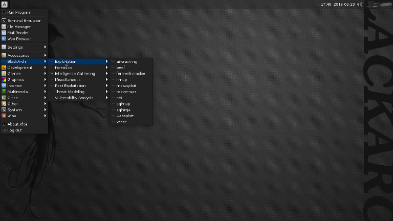 0trace 1.5, 3proxy 0.7, Acccheck 0.2.1, Airflood 0.1, Android-sdk r22.3, Artillery 0.7.3, Autopsy 2.24, Binwalk 1.2.2, Blindsql 1.0, Canari 1.0, Cryptcat 1.2.1, Hashcat 0.47, dentre muitos outros.
