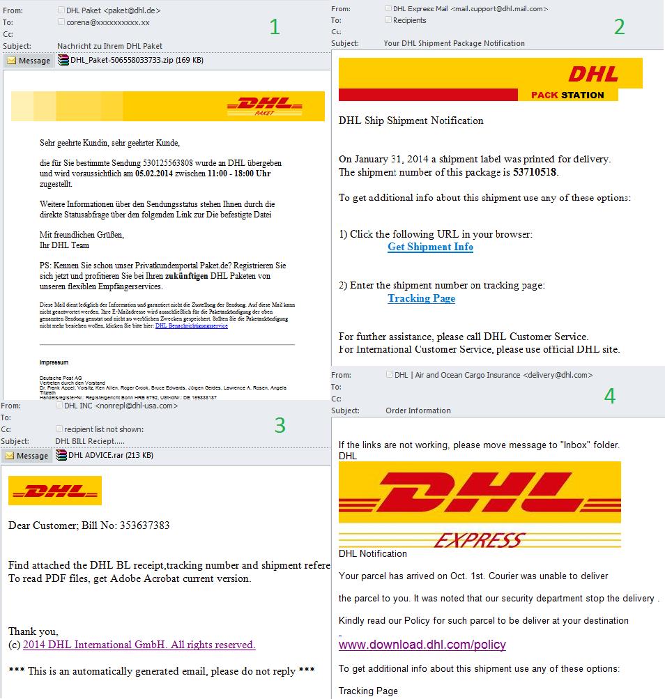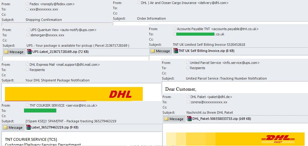 Os endereços de e-mail que se assemelham a legítimos endereços públicos das empresas. Geralmente, eles usam o nome da empresa (DHL INC, TNT Courier, Fedex, etc), no nome do remetente. O nome da caixa de e-mail, muitas vezes, inclui a informação de palavras, serviço, noreply, suporte típico de endereços de e-mail usados para enviar notificações oficiais. O nome do domínio do servidor, muitas vezes tem um domínio real ou muito parecido com o da empresa.