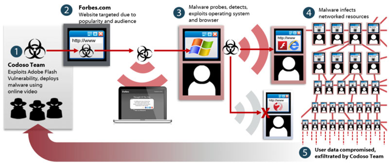 Forbes.com, o 61º site mais popular nos EUA de acordo com o Alexa, foi comprometidao com a intenção de redirecionar certos visitantes para sites que entregam malware, a partir de uma operação de espionagem. Este comprometimento durou de 28 de novembro a 1º de dezembro de 2014, e de acordo com ambos os pesquisadores do iSight Partners e do Invincea, os visitantes atingidos foram aqueles que trabalham para empreiteiros da defesa dos EUA e empresas de serviços financeiros do país.