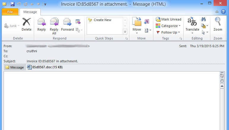 Malware scripting para Microsoft Office tornou-se cada vez mais comum e agindo de forma agressiva ultimamente, devido aos criadores de malware estarem em constante desenvolvimento em relação à novas técnicas para evitar a detecção e enganar os usuários. Este tipo de malware, como mencionado em posts anteriores, geralmente chega como um documento anexado em um e-mail de phishing. Após o "documento" ser aberto, ele baixa o payload, que em seguida baixa e executa o payload final que infecta a máquina host. Em um caso recente envolvendo o malware Dridex, a equipe da McAfee Labs descobriu o método de distribuição típico pelo qual esta praga é disseminada: O malware chega através de um e-mail phishing: