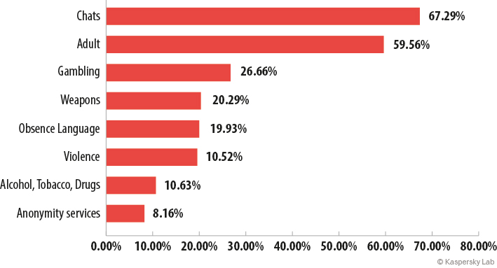 Em termos geográficos, os países com as mais frequentes detecções de Controle Parental foram China, EUA, Alemanha, Reino Unido e Rússia. A França, o Vietnã, Brasil e Argélia também se classificaram entre os dez primeiros em termos de conteúdo inadequado - mas eram relativamente mais seguros devido a uma menor freqüência de detecção. Cada um dos dez países mais afetados tem suas próprias características distintas, quando se trata de ameaças on-line prevalentes para crianças. Por exemplo, conteúdo adulto era a maior ameaça para os usuários na Alemanha (com 172 detecções por usuário), China (apresentando 144,18 detecções por usuário) e os EUA (com registros de 126,16 detecções). Conteúdo sobre álcool, tabaco e drogas apareceu como uma grande ameaça para os usuários da Rússia, Alemanha, EUA e França. A freqüência de detecção foi especialmente elevada nesses países. Este tipo de conteúdo também foi muito popular no Brasil e no Reino Unido.
