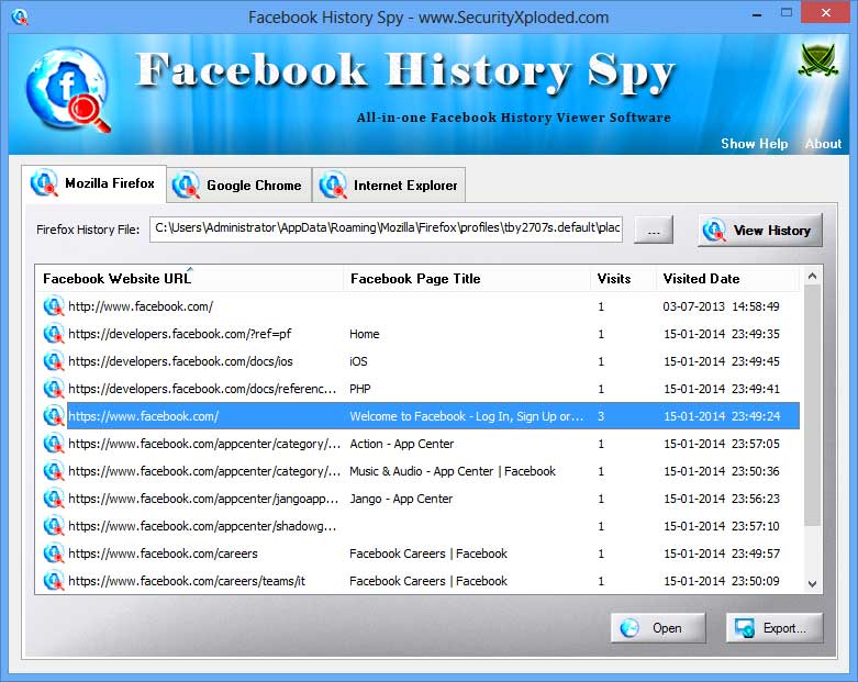 Facebook History Spy é o software all-in-one que foi desenvolvido para recuperar instantaneamente ou visualizar o seu histórico do Facebook na Web a partir de browsers populares. Recentemente, sua versão 2.5 foi liberada. Este utilitário ajuda na recuperação ou visualização do histórico de Facebook a partir dos seguintes navegadores: Mozilla Firefox, Internet Explorer, Google Chrome, Google Chrome Canary/SXS, CoolNovo (variante do Chrome), Palemoon Browser (variante do Firefox) e SeaMonkey Browser. Ele detecta automaticamente o arquivo de banco de dados do histórico com base no navegador e na configuração do usuário atual.