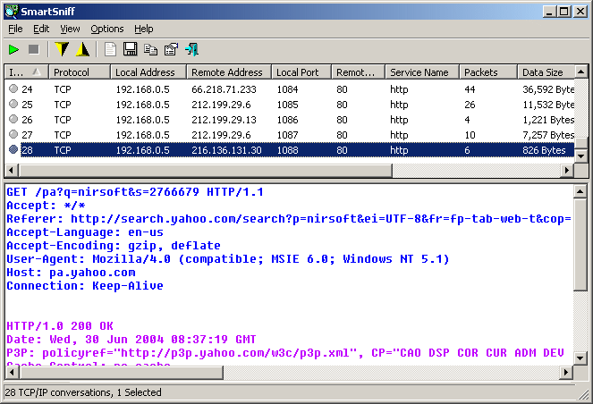 SmartSniff é um utilitário de rede de monitoramento, que permite a captura de pacotes TCP/IP que passam pelo seu adaptador de rede, além de possibilitar a visualização dos dados capturados como sucessão de conversas entre clientes e servidores. Você pode visualizar as conversas TCP/IP em modo ASCII (para protocolos baseados em texto, como HTTP, SMTP, POP3 e FTP). Ou como hexadecimal. (Para protocolos de base não-texto, como DNS). SmartSniff fornece três métodos para capturar pacotes TCP/IP: Raw Sockets (Apenas para Windows 2000/XP ou versão superior): permite capturar pacotes TCP/IP em sua rede sem instalar um driver de captura. Este método tem algumas limitações e problemas.