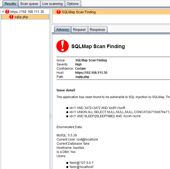 Caso queira, a pessoa também pode usar a guia API SQLMap para selecionar o IP/Porta no qual for executar, bem como o path para Python e sqlmapapi.py em seu sistema. Uma vez que a API SQLMap estiver em execução, é apenas uma questão de "clicar com o botão direito do mouse" na sub aba 'Request', e escolher "SQLiPy Scan". Isto irá preencher a guia SQLMap Scanner do plugin com informações sobre esse "request". Ao clicar no botão "Start Scan", será executada uma varredura. Se a página for vulnerável a injeção de SQL, em seguida, uma thread do plugin irá verificar os resultados e adicioná-las à guia "Scanner Results".