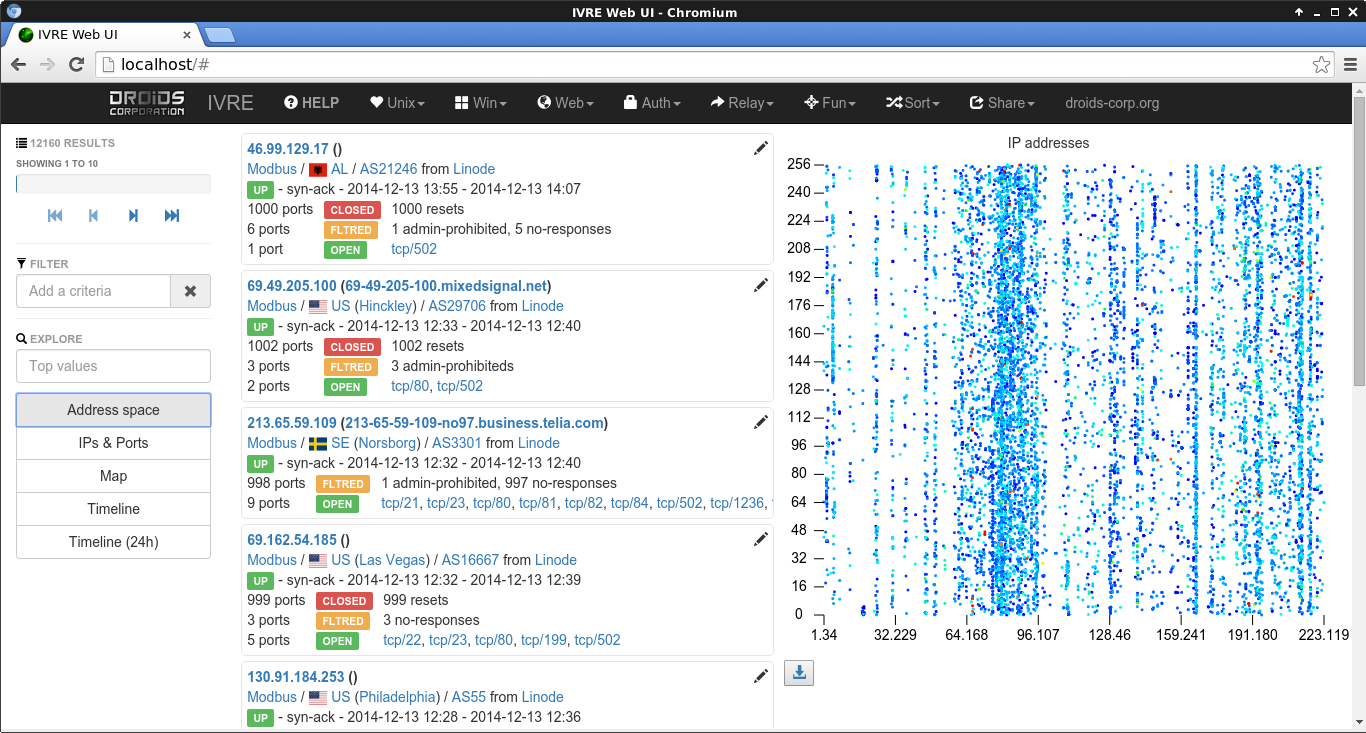 Vale lembrar que IVRE se baseia em: Python 2, versão 2.6 (mínima); módulo de Crypto; módulo pymongo (com a versão 2.7.2 no mínimo); Nmap & zMAP; Bro & p0f; MongoDB (versão mínima 2.6). Além disso tudo, um servidor Web (testado com sucesso com Apache e Nginx, deve funcionar com qualquer coisa capaz de servir arquivos estáticos e executar um CGI baseado em Python), embora um servidor de teste Web agora seja distribuído com IVRE (httpd-ivre).