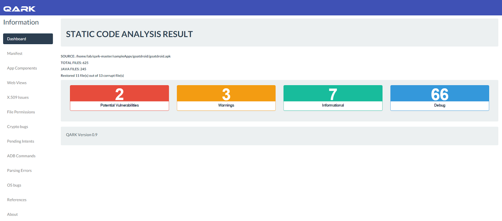 A pasta sampleApps contem APKs que podem ser testados em relação a QARK. Para a utilização da ferramenta, é preciso ter Python 2.7.6, JRE 1.6 ou versão mais recente (de preferência 1.7 ou versão posterior), OSX ou Linux Ubuntu (Outros podem até funcionar, mas não foram totalmente testados). Vale ressaltar que ao contrário dos produtos comerciais, QARK é 100% livre para usar. QARK automatiza o uso de múltiplos processos de decompilação, como já foi citado anteriormente, processo este que auxilia em saídas integradas para produzir resultados superiores quando faz qualquer tipo de referência a um APK. Finalmente, a grande vantagem apresentada é que QARK tem mais ferramentas tradicionais, que apenas apontam para possíveis vulnerabilidades, podendo produzir comandos ADB, ou mesmo APKs totalmente funcionais, que se transformam em vulnerabilidades hipotéticas onde há um trabalho envolvendo exploits "POC".