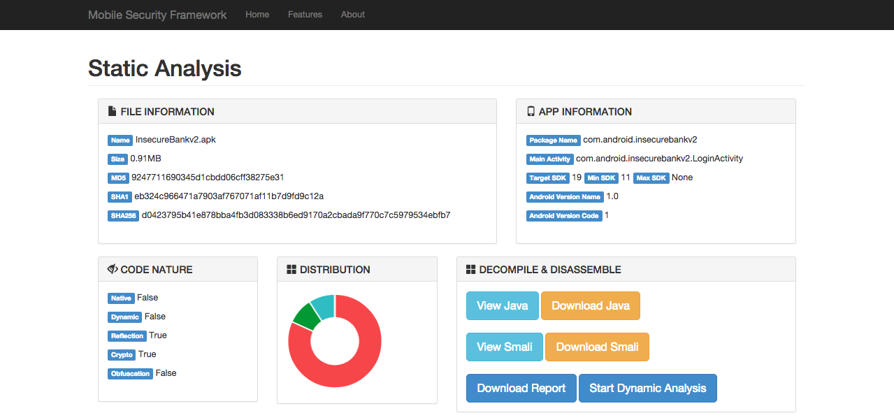 Ele suporta binários (APK & IPA) e código-fonte zipado. O analisador estático da ferramenta é plenamente é capaz de realizar uma avaliação automática de código, detectar permissões inseguras e configurações, e detectar código inseguro como SSL overriding, SSL bypass, criptografia fraca, códigos obfuscados, permissões impróprias, segredos codificados, uso indevido de APIs perigosas, vazamento de informações sensíveis e informações PII e armazenamento de arquivos inseguros. O analisador dinâmico executa o aplicativo em uma máquina virtual ou em um dispositivo configurado, e detecta os problemas em tempo de execução. Uma análise mais aprofundada relacionada a isso é feita a partir dos pacotes de rede que foram capturados, decriptografia de tráfego HTTPS, relatórios de registros, erros ou "crashes", informações de depuração, "stack trace" e ativos de aplicações como a criação de arquivos, preferências e bancos de dados. Ressaltando que este framework é altamente escalável, para o qual é possível adicionar regras personalizadas com muita facilidade. Além de tudo, um relatório rápido e objetivo pode ser gerado no final dos testes realizados.