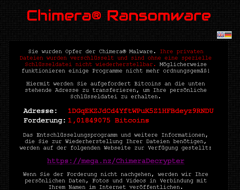 "Sie wurden Opfer der Chimera Malware. Ihre privaten Dateien wurden verschlusselt und sind ohne eine spezielle Schliusseldatei nicht wiederherstellbar. Moglicherweise funktionieren einige Programme nicht mehr ordnungsemass!"