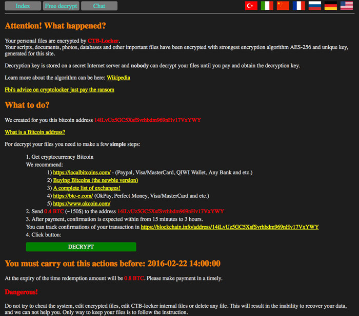 Depois de haver uma desaceleração considerável em seu processo de distribuição, o perigoso ransomware CTB Locker está sendo liberado de novo para usuários, e desta vez, o seu executável foi assinado com um certificado roubado. Mas o que é ainda mais interessante e preocupante nisso tudo, é que há uma nova variante do malware, e esta tem como alvo sites ao invés de ambientes de trabalho que executam Windows. De acordo com um pesquisador de segurança, pelo menos 102 sites já foram infectados messe processo, e a campanha de infecção recomeçou por volta do dia 12 de fevereiro. Esta nova index.php será então usada para criptografar dados do site usando a criptografia AES-256, e para exibir uma nova página que contenha informações sobre o que aconteceu com os arquivos e como fazer um pagamento de resgate. O malware criptografa todos os arquivos localizados no servidor - dois arquivos aleatórios com uma chave, e o restante com outra chave.
