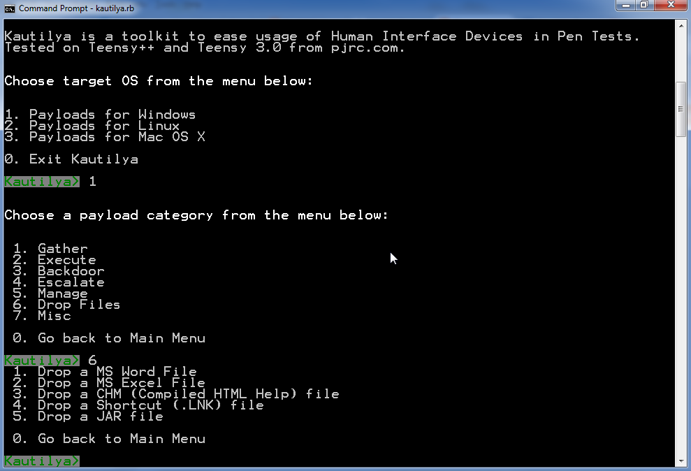 Kautilya, para quem não sabe, é um conjunto de ferramentas que oferece várias payloads úteis para um dispositivo de interface humana, que pode ajudar a fazer um "breaking" em um computador durante testes de penetração. Dentre a lista de payloads, consta: