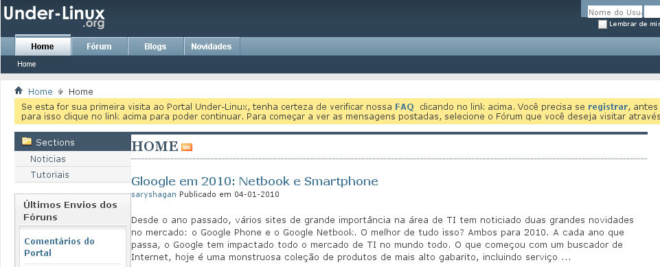 Como começar? Na página inicial do novo Portal Under-Linux (http://under-linux.org), você verá uma enorma caixa de texto amarela, logo abaixo do menu principal (Figura 1). Nela você verá instruções específicas de como proceder para criar seu novo usuário. De início o texto incentiva a leitura da FAQ (Frequently Asked Questions, ou no Português, Perguntas Mais Freqüentes) do Under-Linux. Nós recomendamos! Lá você encontrará todas as informações referentes ao funcionamento do Portal Under-Linux, e como você deverá se comportar como novo usuário.