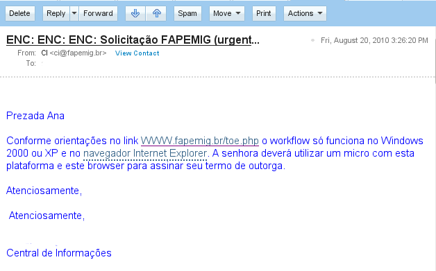 No meu gabinete, na faculdade, tenho 3 máquinas. Uma roda MacOS, outra roda Linux e outra, da minha colega, roda Windows Vista. Se eu não encontrar uma boa alma que tenha XP e IE no seu micro, sou forçada ou a comprar ou a piratear esses programas para poder receber um auxílio a pesquisa, ou seja, ou a PRODEMGE está vendendo Microsoft, ou estimula a pirataria, ou ambos. Nenhuma outra alternativa. Vergonhoso. Copio abaixo a última mensagem recebida, quando perguntei se eles poderiam me indicar alguém que instalasse o programa no linux ou no Mac: