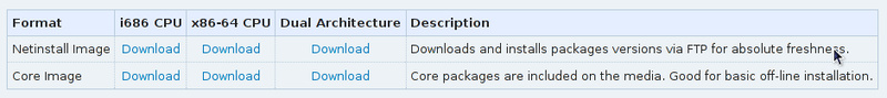 Então tá. Vamos iniciar com o download da mídia para a instalação. Lembre-se que o Arch Linux é compilado para rodar com processadores i686 ou mais novos, tanto 32 como 64 bits.