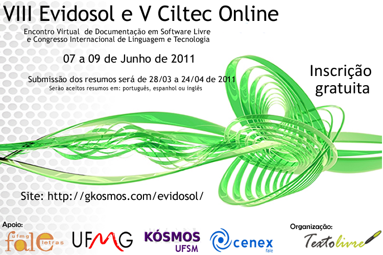 O VIII Encontro Virtual de Documentação em Software Livre (EVIDOSOL) e V Congresso Internacional de Linguagem e Tecnologia online (CILTEC-online), promovido com o apoio da FALE/UFMG, projeto Texto Livre e colaboradores, convida a todos para para mais uma reunião em torno do eixo temático “Linguagem e Tecnologia”, a ocorrer de 07 a 09 de junho de 2011.