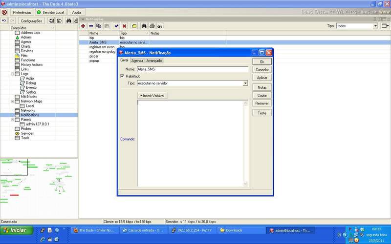 PS: Para receber o alerta vc precisa adicionar o alerta no serviço que deseja ser informado em cada radio que queira monitorar via SMS, eu por ex. usei nos radios de enlace e somente no ping, sendo assim dê um duplo clique em cima do radio que deseja monitorar, vá na aba SERVIÇOS, duplo clique em cima do serviço (no meu caso PING) marca NOTIFICAÇOES e marca Alerta_SMS.