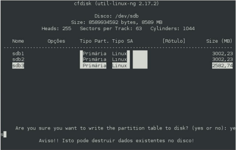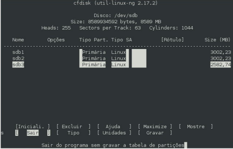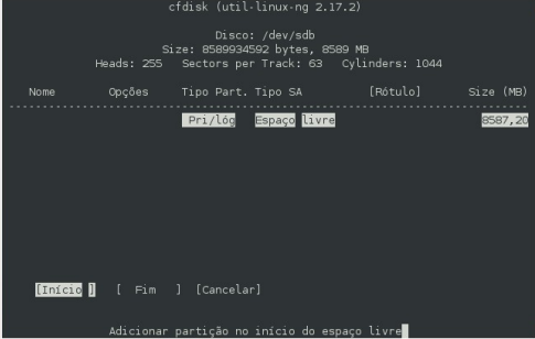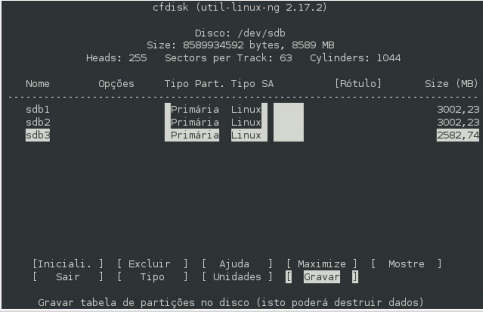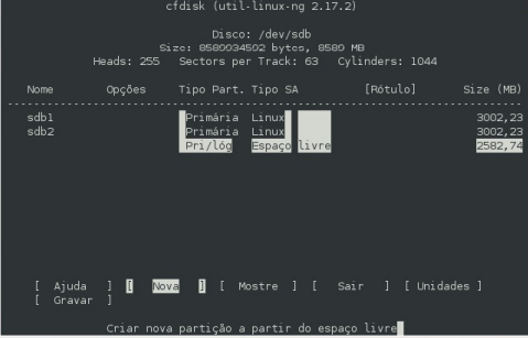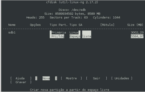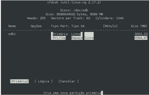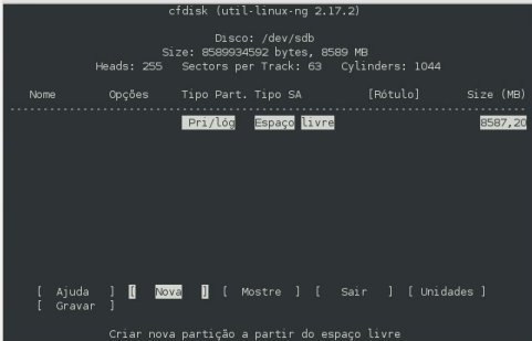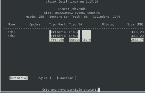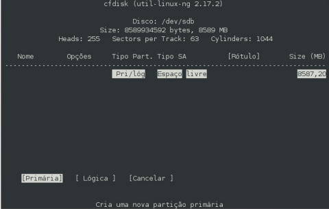 6- digite cfdisk /dev/sdb e siga as instruções nas imagens a baixo, para criar a tabela de partições. No exemplo destas imagens é um HD de 8 GB sendo dividido em 3 partições.