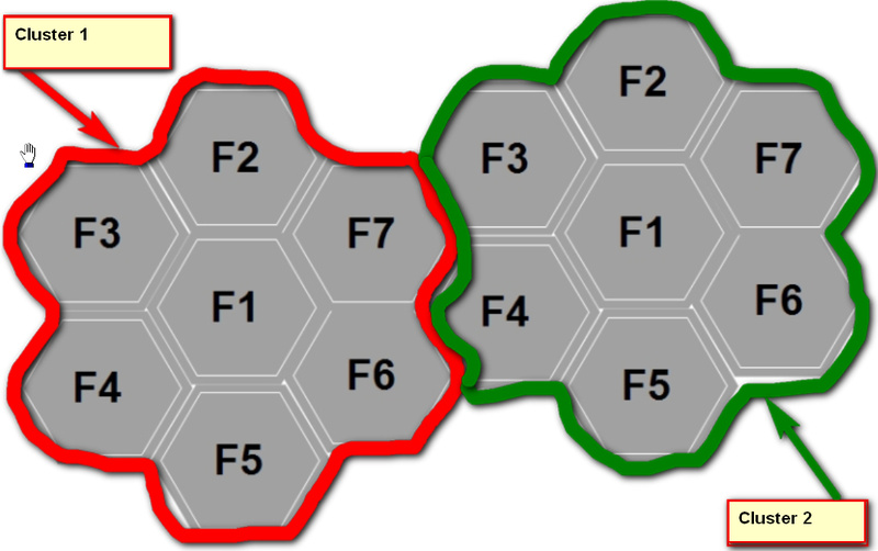 Caso essa célula não seja suficiente para cobrir a área desejada, é colocada mais células em seu torno com frequências formando um cluster de células, cada uma com frequência diferente.
