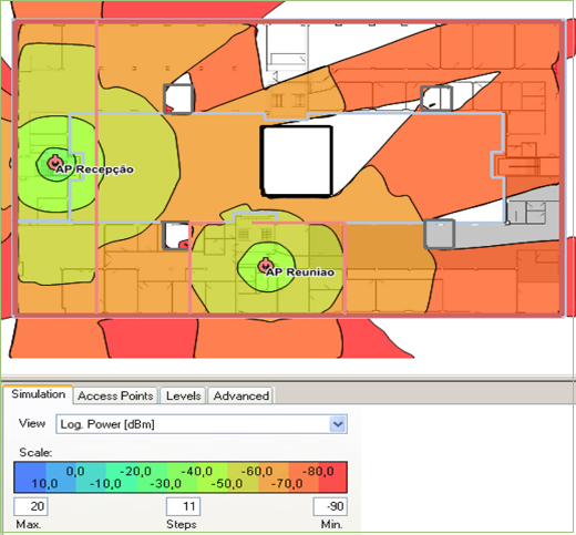 Para que uma rede wireless funcione é fundamental um bom projeto antes de iniciar sua execução de um projeto com radiofrequência deve ser avaliado vários problemas relativo a fenômenos naturais e como se comporta em diferentes situações, mesmo em uma rede de uso doméstico exige atenção e cuidado ao se determinar sua área de cobertura, paredes, metais, aquários, plantas, móveis e etc. são obstáculos para as redes sem fios, um equivoco que alguns tem é no primeiro problema de cobertura que encontra aumentar a potência, essa não é a melhor forma, antes de tudo precisamos avaliar outras alternativas como verificar linha de visada, ou seja não pode ter obstáculos entre os equipamentos wireless, caso exista algum obstáculo faça uso de antenas externas para traspor os obstáculos, se você deseja transmitir para todas as direções use antenas do tipo unidirecional, se deseja transmitir em apenas uma direção use antenas direcional, essas são mais eficientes pois concentra o sinal e tem maior ganho e melhorarndo a seletividade evitando possíveis interferências de outosa equipamentos de RF, na próxima imagem temos um estudo de site survey indoor, perceba as zonas de cobertura esse estudo pode ser feito com o uso de uma analisador de espectrum ou com uso de equipamentos e softwares para determinar a cobertura da rede. Um exemplo de site survey indoor para o padrão 802.11 pode ser visto na planta abaixo, é uma simulação feita com o software RF3D Wifiplanner.
