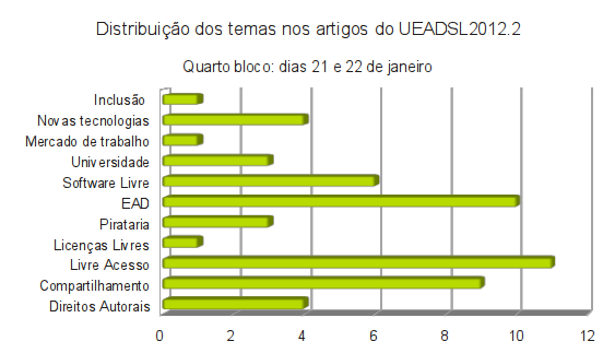 As propostas do quarto grupo do UEADSL2012.2, correspondendo aos dias 21 e 22 de janeiro, a atenção divide-se entre Cultura Livre e o tema relacionando Universidade e EAD, ambos os temas com grande número de trabalhos neste grupo. O Software Livre, na sua relação com EAD e com Universidade também aparece em alguns trabalhos. A distribuição dos temas nos trabalhos deste bloco está ilustrada no gráfico abaixo.