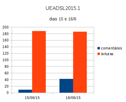 Hoje o UEADSL2015.1 começa bem o dia. Observamos um movimento significativo de um dia para o outro: um leve aumento nos acessos do primeiro para o segundo dia(gráfico 1, não há diferença significativa); ao mesmo tempo, um aumento expressivo de comentários (gráfico 2).