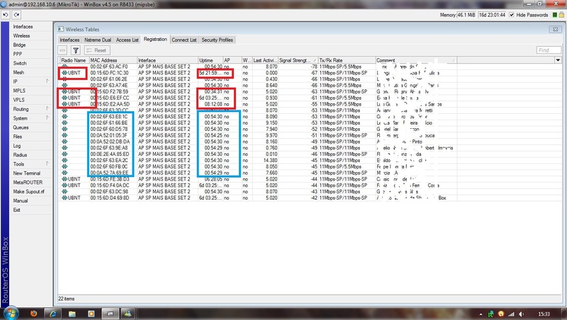 Amigos fiz a desmarcação do TKIP nos meus cartões, mas ainda continuou o problema, tenho clientes instalados com AP´S engenius esr1221, edimax ew7209 esses com aprouter 6.1....e analisando o que o Sergio comentou sobre atualização de firmeware o problema deve taí....pq verificando no registration vi que os UBIQUITI (nano e bullet) e algumas placas que infelizemente ainda tenho na rede o problema não acontece. Vou tentar uma versão mais recente do aprouter depois posto aqui o resultado. Em anexo confirmo o que estou dizendo..o que está em azul são os ap router´s, o vermelho UBIQUITI...notem que o tempo dos azuis são identicos pela desconexão e conexão simuntanea...a unica coisa que consegui foi mudar dentro do PROFILE o "Group Key Update" para 1 hora (default vem em 5 min) daí a desconexão e conexão dos clientes fica de 1 em 1 hora.... não consegui tempo maior.