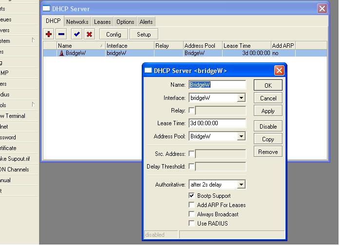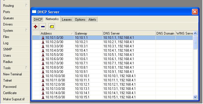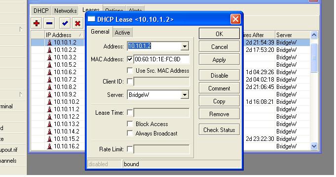 Para criar o DHCP IP >> DHCP Server veja a imagem em anexo, na aba networks em DNS coloquei o mesmo IP que usava no BFW, para meus clientes que usavam IP fixo, não perderem a navegação, para funcionar com esse IP no DNS, tive que criar um DNS cache em IP >> DNS ( tem uma imagem também), mas voltando ao DHCP, na aba leases coloquei os IP`s e mac`s dos clientes conforme imagem.