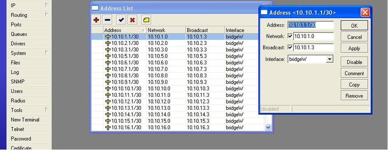 bom, primeiro criei os IP`s em IP >> Addresses , anexei um print do mesmo, nessa Bridge que aparece na imagem estão as 3 interfaces wireless que são ligadas nas setoriais (Uso o Mikrotik na torre servindo como PC/AP e fazendo o controle, embaixo uso o BFW fazendo Load Balance).
