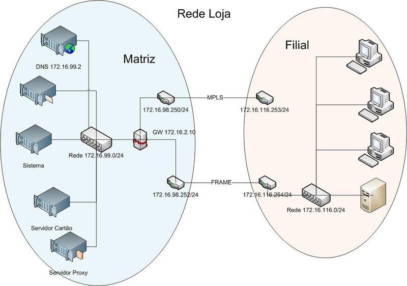 Oi pessoal, estou com o seguinte problema, temos a Matriz de uma empresa que interliga suas filiais com um MPLS e um Frame Relay, por onde passa o trafe de internet, o TEC, os acessos ao sistema da empresa via telnet e TS . Hoje o trafego passa pelo Frame, quando este cai o usuario da filial precisa fisicamente trocar para o MPLS e o gestor altera a rota no gateway. Gostaria de colocar um Mikrotik na Filial dividindo a carga entre o MPLS e o Frame e quando um deles cair automaticamente transferir o trafego para o outro. É possivel? Como fazer? Segue um layout da rede: