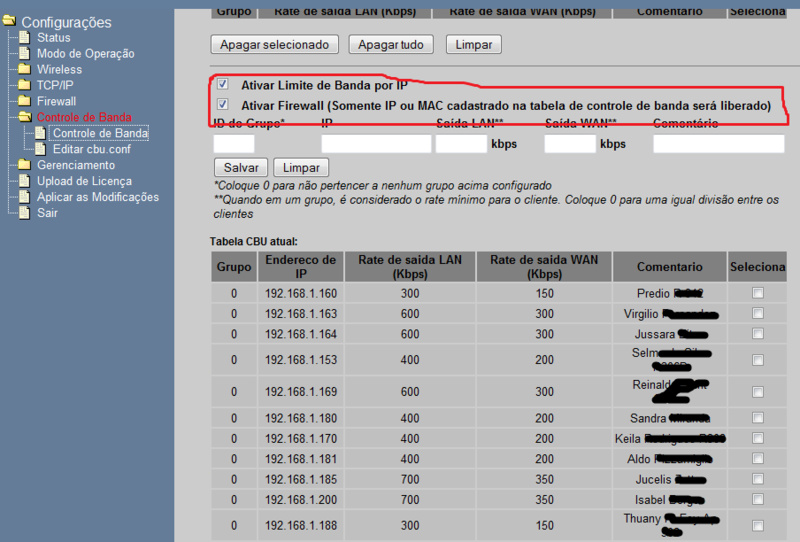 x - Ativar Firewall (Somente IP ou MAC cadastrado na tabela de controle de banda será liberado).Depois vai Gerentiamento:
