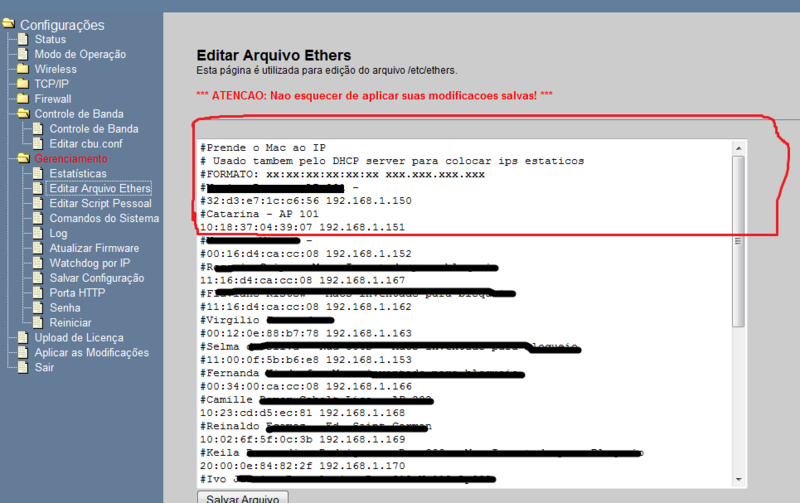Para editar o arquivo /etc/ethers via interface web, basta entrar no menu Gerenciamento - Editar Arquivo Ethers. O padrão do arquivo segue o modelo acima, composto pelo MAC IP. uma vez editado, clique no botão "salvar arquivo" e suas alterações serão salvas.