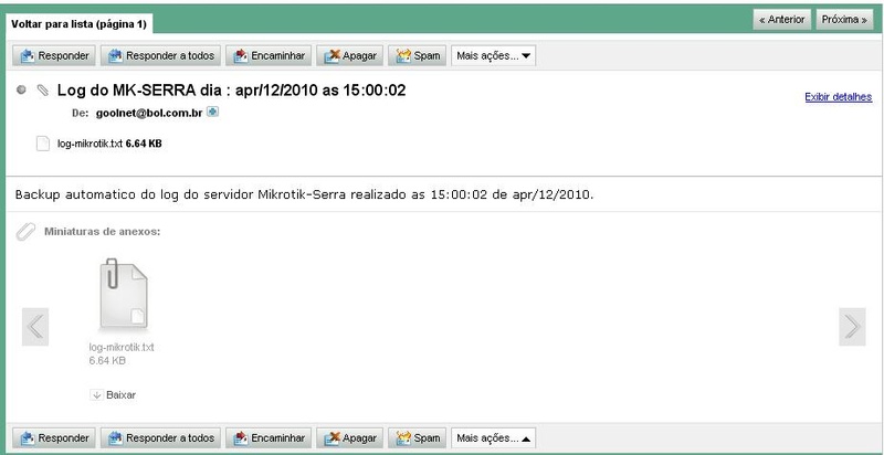 Escolhi o Gmail porque tem muito espaço de caixa de entrada e um recurso próprio que facilida a visualização dos logs sem a necessidade de baixar anexos. Isso faz muita diferença pois infelizmente o arquivo ".txt" que o RouterOS gera é no padrão Unix, é muito complicado de visualizar no bloco de notas do Windows.