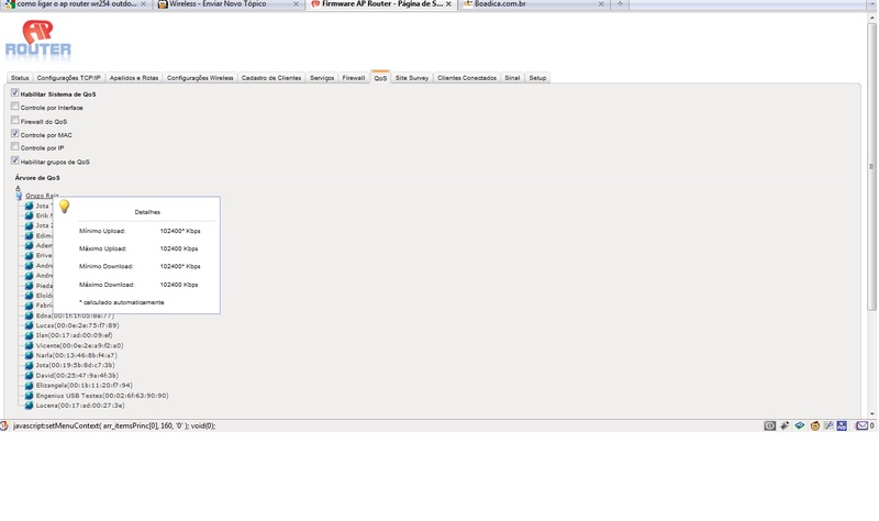 Não tenho muita experiência no assunto wireless,mas mesmo assim montei uma pequena rede com alguns amigos bem próximos usando o equipamento acima citado com uma Omni de 15dbi e como acabei de comprar esse AP,estou apanhando,pois esta semana aumentei meu link de 1MB para 4MB,mas no AP exatamente na aba QOS ainda está mostrando 1024,ou seja,só está entrando 1MB.Até já tentei alterar para a velocidade nova,mas simplesmente não salva a alteração.Ele veio com a firmware 8.2c e estou usando no modo Gateway.Vejam a imagem abaixo: