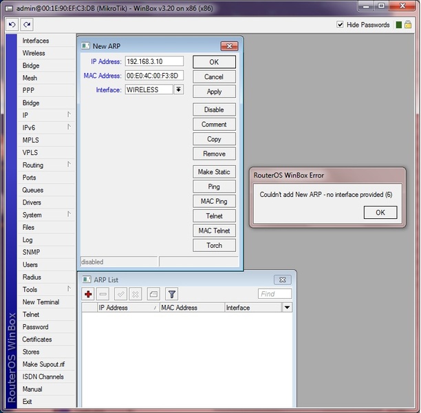 ate agora so consegui cadastrar os macs do clientes so que qunado vo amarrar o ip no mac da esse erro couldnt add new arp no interface provided (6).