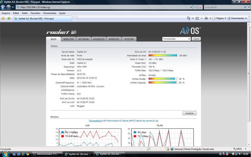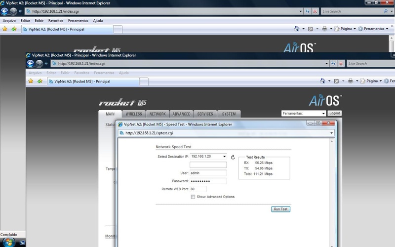 Boa noite galera, desculpe pela demora, mas finalmente fiz meu enlace e utilizei Rocket M5 e antenas disco 30dbi da ubiquiti, olha estou muito satisfeito com a quantidade (54Mbps full) q fechou o enlace nao irei utilizar nem metade, e acredito que dava para melhorar alinhando melhor as antenas, veja as imagens, quero aproveitar para agradecer o Paulo Kleber (pkmc) pois além de ele me indicar este equipamento também em ajudou a configurar.
