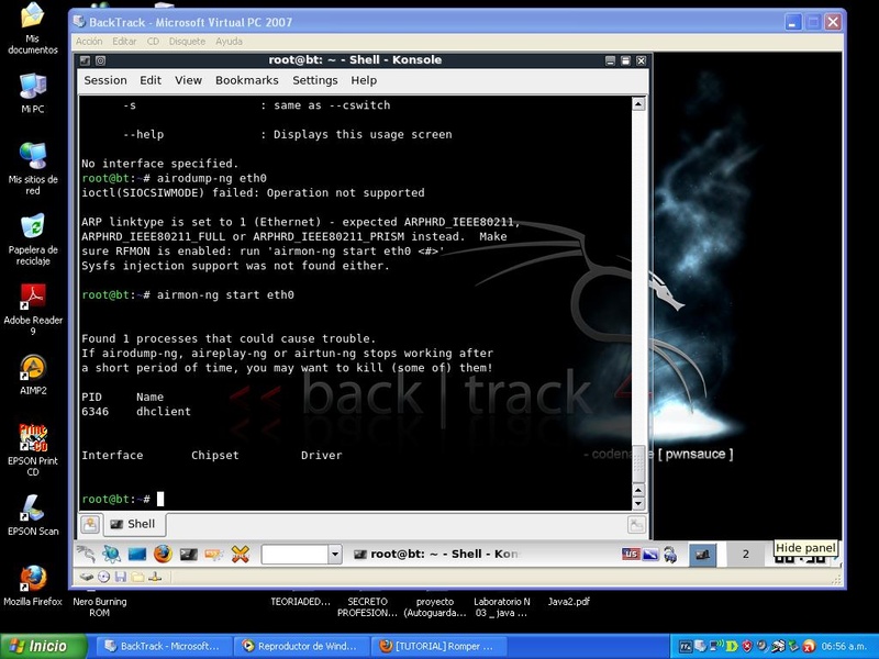 bueno, primero describo que uso, estoy usando backtrack 4 final.iso y lo toy virtualizando en virtual pc 2007, la tarjeta de red que tengo es una D-LINK Airplus DWL-G520 (rev.B), bueno mejor les mando una imagen pa que vean, ya que una imagen vale mas que mil palabras.